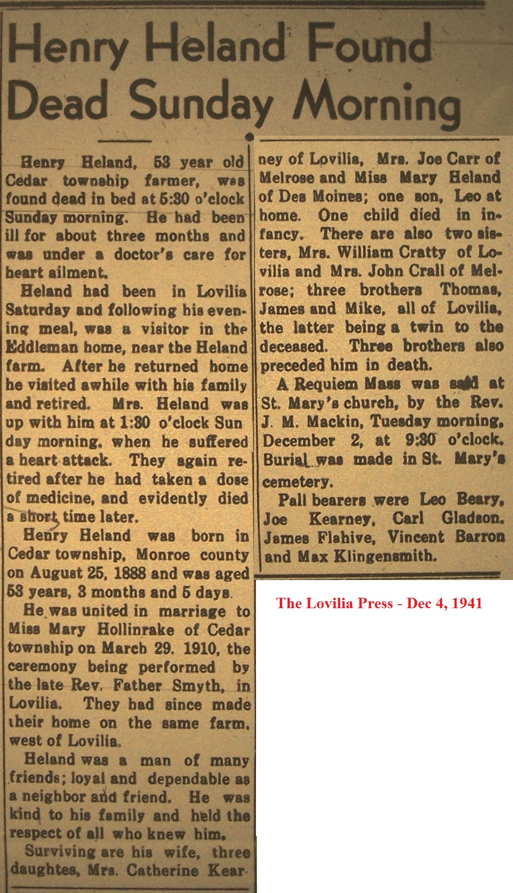 HumestonJoseph Death Notice