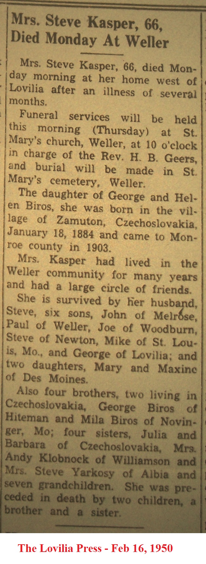 KasperMary Obituary